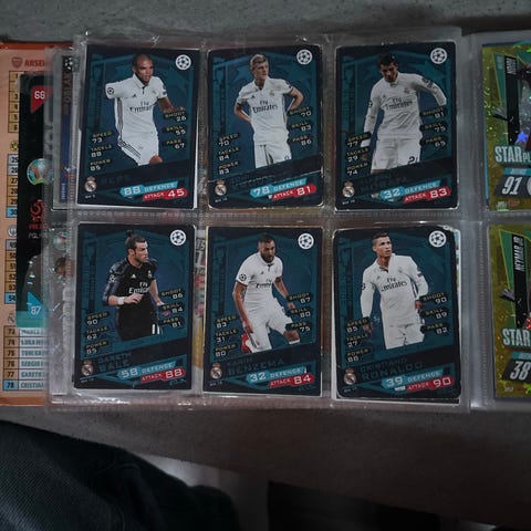 Samling av fotballkort med spillere fra Real Madrid. Kortene viser ulike spillere i klubbens hvite drakt. Passer for samlere og fotballinteresserte.