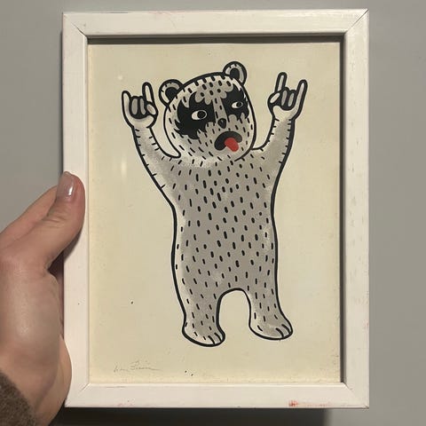 Jeg selger et trykket motiv av bildet "Dyrene i tog", laget av kunstneren Ane Tollerød Fosse / Tails. Hvit ramme med glass følger med om ønskelig.