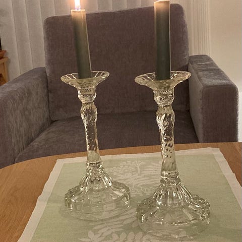 To lysestaker i glass. Den største er 30 cm høy, den minste er 21 cm