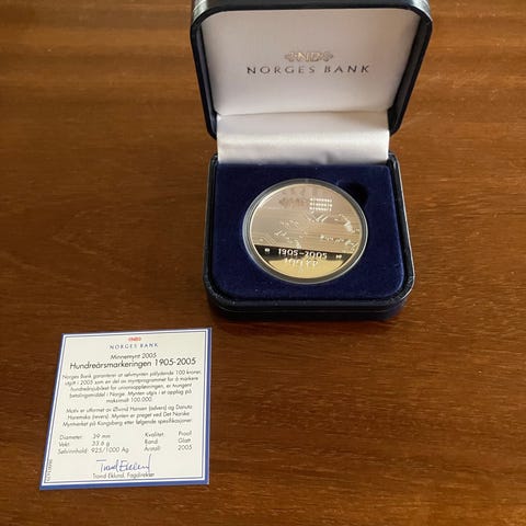 Hundreårsmynten ,100 kroner 2005 UNC ,Nr.3 Stor Sølv, Se bilder for kvalitet