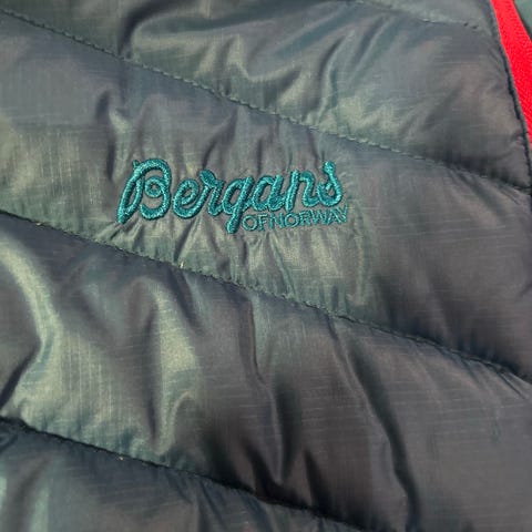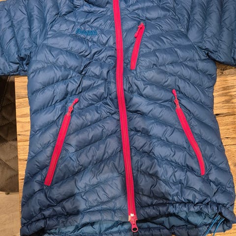 Bergans dunjakke til dame i farge blå/turkis med rosa glidelås .