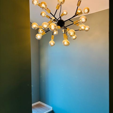 En gulv lampe, en tak lampe, to vegg lamper og to bord lamper. Modell ‘’Borg’’ fra MS-belysning