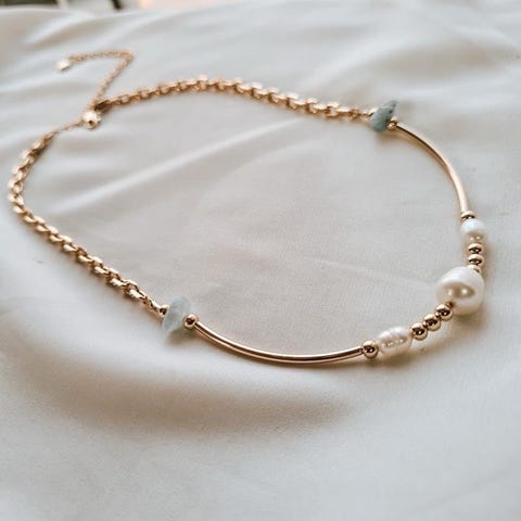 Selger et nytt og ubrukt gullbelagt halskjede av 18K gull og PVD plated stål som gjør at de tåler vann, med en ekte ferskvannsperle-anheng.