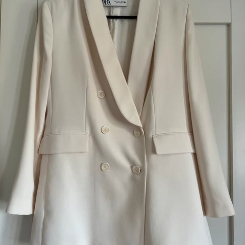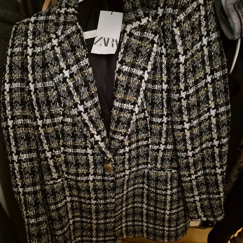 Unikt blazer i vevd grønn tekstur med bred krage og fire gullknapper i front. Dobbelspent design og tykkere stoff gjør den perfekt for kjølige dager – et statement-plagg med både varme og stil.