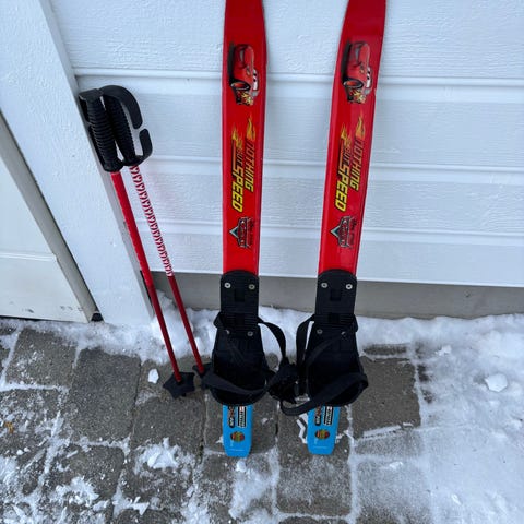 Skiene har er 140 cm lange, stavene er 90 cm og støvlene er størrelse 35