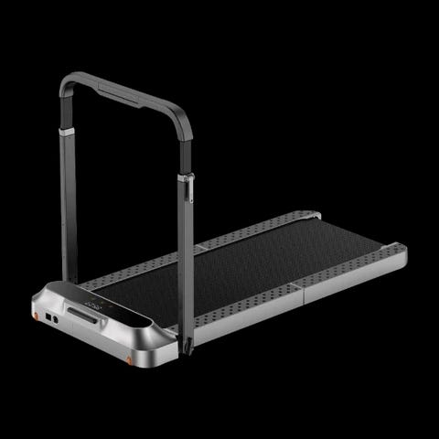 Walkingpad R2 tredemølle med svart løpebånd og håndtak. Utstyrt med kontrollpanel for justering av hastighet og andre funksjoner. Designet for innendørs bruk til trening og kondisjonsøvelser. 12 km hastighet. Blir veldig liten hvis du ønsker å ta den fram og tilbake