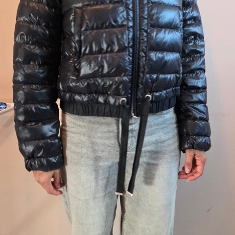 Glidelåsen foran er ødelagt, men med nål og tråd så er den like fin igjen. Samme med venstre lomme, se bilder. Ellers så er den grei.