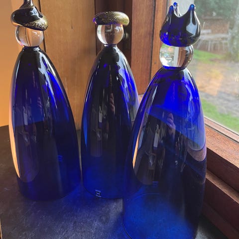 De hellige tre konger / de tre vise menn fra Hadeland glassverk designet av Maud Gjeruldsen Bugge selges for 850 kr. De er hele og pene, det er bare esken som er slitt.