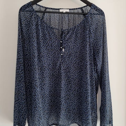 Va Vite bluse i oransje, laget av polyester. Blusen er i størrelse 42 for kvinner. Den har lange ermer og en rund hals med knapp bak.
