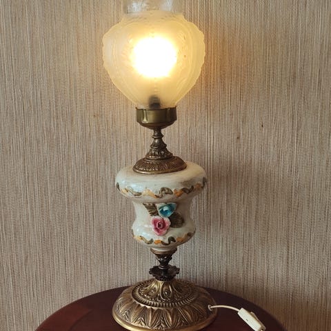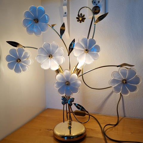 Pent brukt bordlampe inkl. lyspærer. Håndlaget glass og messing. Trolig kjøpt fra lampemagasinet