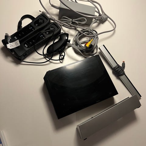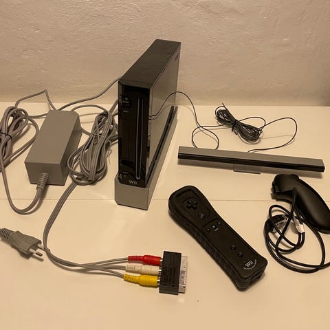 Nintendo Wii spillkonsoll med kontroller og Super Mario Bros Wii