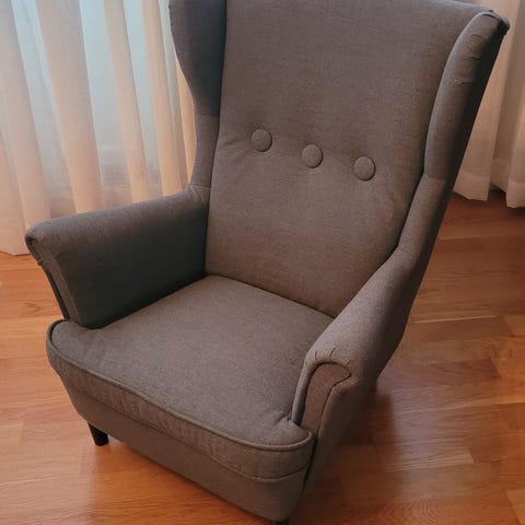 Selger en meget komfortabel og stilren lenestol (ørelappstol) i lys blå/grå farge. Stolen er pent brukt, ren i stoffet og uten flekker eller skader. Stabil konstruksjon og god sittekomfort.