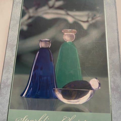 Julekrybbe fra Hadeland Glassverk i serien Sparkling Christmas. Figurene består av Josef, Maria og Jesusbarnet i krybbe. Komplett sett med original emballasje/eske. Hele og oene ikke brukt.