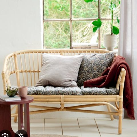 Lenestol med hvite trearmer/ben og trekk i grønt stoff med stripemønster. Passer for innendørs bruk som sittemøbel.