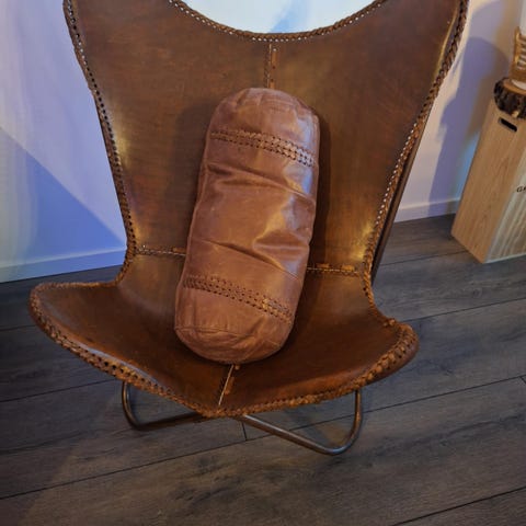 Selger en unik og eksklusiv lounge chair i ekte skinn, klassisk butterfly-design. Stolen har et tidløst uttrykk og gir karakter til ethvert rom. Naturlig patina i skinnet som kun blir vakrere med tiden.