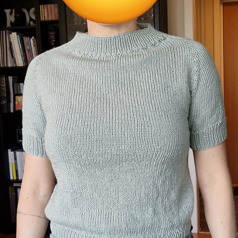 Mint- farget ullgenser, strikket m Sandnes Sundby garn og pinnenr 3. Oppskrift «Kelly- genser med splitt» av Anita B. Bezenberg.