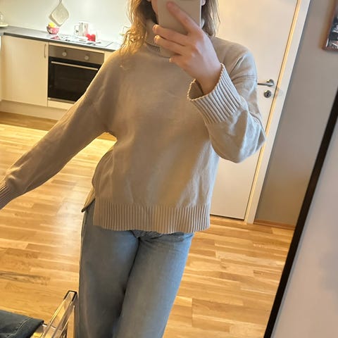 Genser er ubrukt og har splitt i sidene og litt vid i endestykket på armene. (Person på bildet bruker str M).