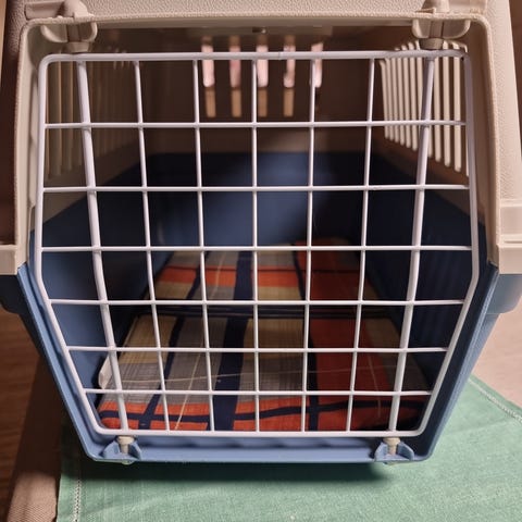 Ferplast Atlas 10 transportbur med mål 60x40x38 cm, i blå og beige plast. Buret har ventilasjonsspor på sidene og metallgrind i front. Egnet for transport av små dyr. Buret er godkjent for reiser med fly.