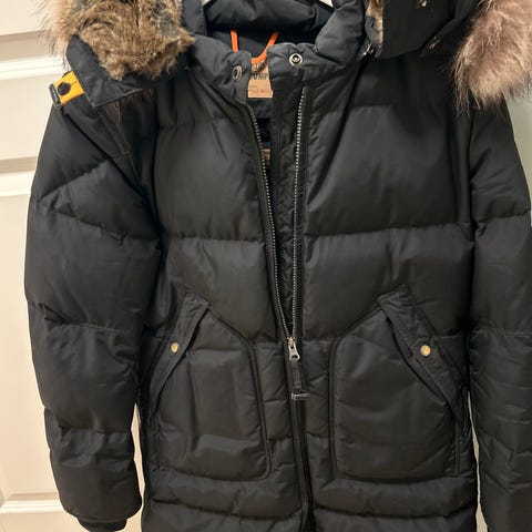 Lite brukt parajumper parkas, svart, str xs. Ser nytt ut. Mange lommer, toveis glidelås. Hette og pelskrage kan tas av. Ingen mangel, slitasje eller skade. 90% down og 10 % feather. kr 2500