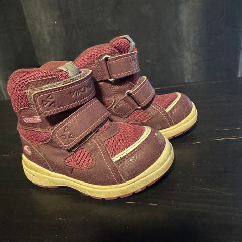 Viking barnesko for jente i størrelse 22. Skoene er rosa og designet for å passe barns føtter. De har borrelåsfester for enkel påkledning og avkledning. Brukt på et barn.