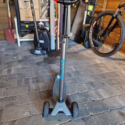 Micro Mini Deluxe sparkesykkel i gul farge. Utstyrt med tre hjul for økt stabilitet, egnet for barn. Laget i robust materiale for utendørs bruk.