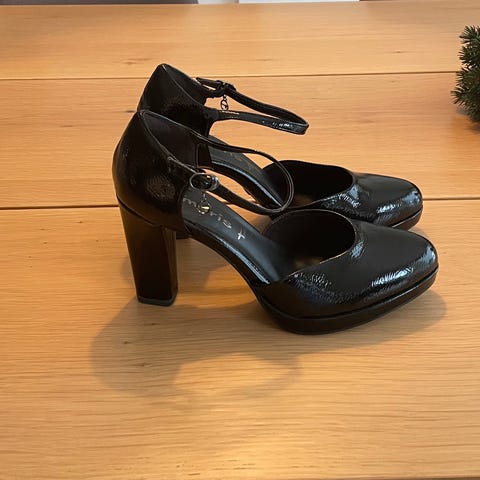 Tamaris pensko i størrelse 37 med svart farge. Skoene har åpen tå og ankelrem med spenne. Hælhøyde er middels, og skoene har en glatt såle. Materialet er vegansk.
