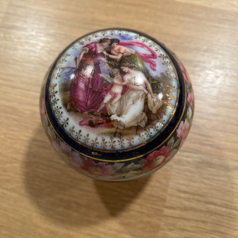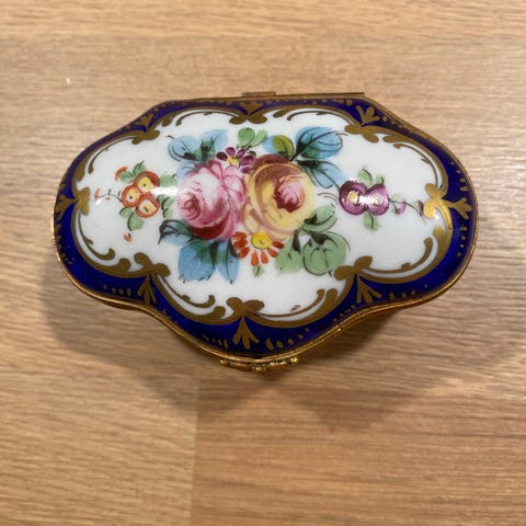 Skjelden vakker gul porselens boks antikk gullvare og håndmalte rosa blomster med grønne blader på gult. På innsiden er det mer håndmalte blomster. Denne boksen har et skallsteng og er merket på bunnen DECOR HOVEDPORCELAINES - CHAMPS ELYSEES - PARIS FRANKRIKE. Meget godt bevart og boksen er i fin stand og har bare noe mindre malingstap / slitasje i underkanten.