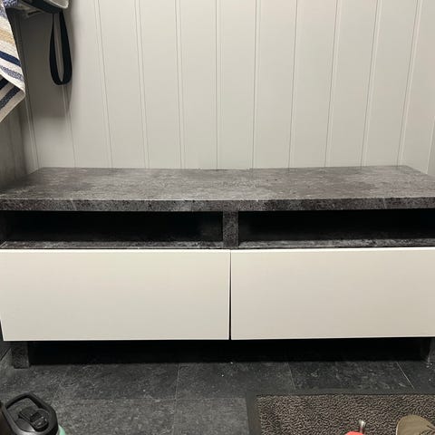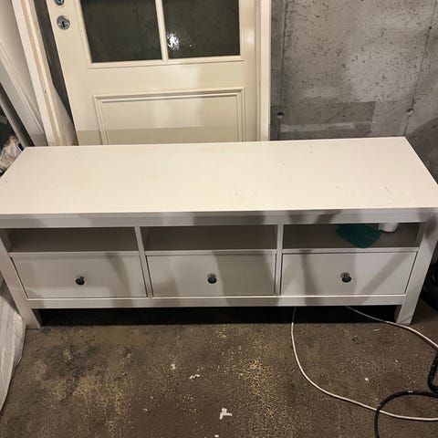 TV-benk fra Jysk. Har malt platene sorte, men tror det skal være mulighet for å skrape det av (se de siste bildene for hvordan platene er orginalt). Eller så kan man sette på kontaktplast på platene.