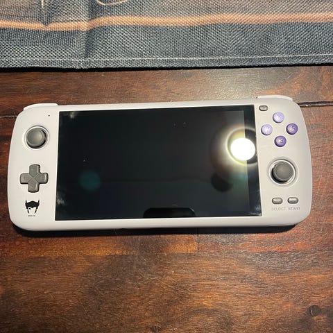 TrimUI Smart pro med 3D-printet «comfort grip» og 32GB SD-kort med CrossmixOS for litt bedre ytelse. Kan emulere opp til n64 og noe PSP. Kommer med Moonlight-klient for spillstreaming fra PC.