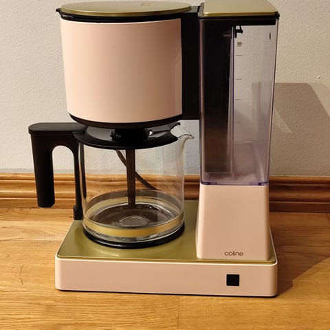 DeLonghi kaffetrakter med glasskanne og deler i metall og plast.