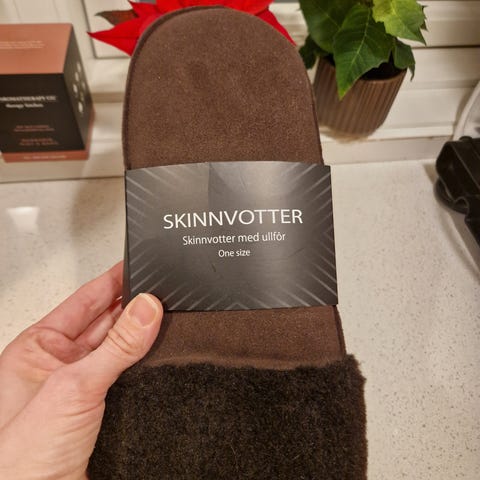 Svarte skinnvotter med ullkant og en liten spenne på oversiden. Varmt og veldig mykt for inni. Størrelse M, men passer mer S. Kjøpt på marked for 800,-. Aldri brukt fordi jeg har andre og disse blir liggende.