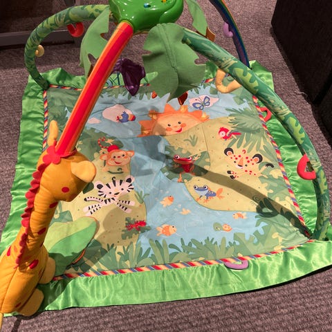 Fisher-Price lekematte med fargerike mønstre og hengende leker. Inkluderer flere avtakbare leker som kan festes til buen. Passer for spedbarn og småbarn, designet for å stimulere sansene og motoriske ferdigheter.