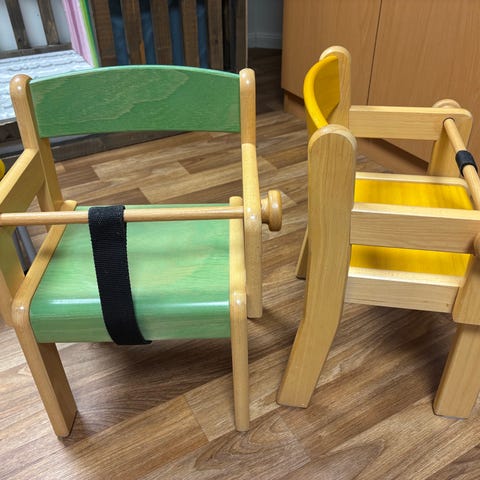 IKEA antilop barnestol med hvit plastbrett og ben som er foliert.. Stolen har en fotstøtte i tre og sikkerhetssele. Beina har folie som ikke har vært der orginalt, og fotstøtten er også kjøpt separat (Amazon) og er ikke fra IKEA.