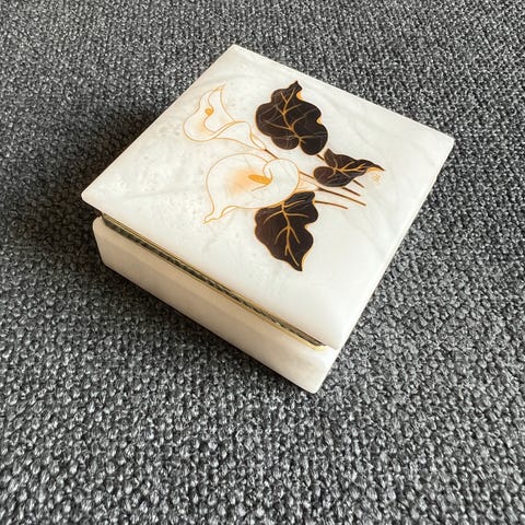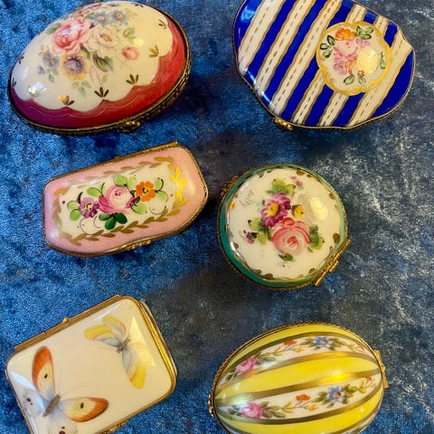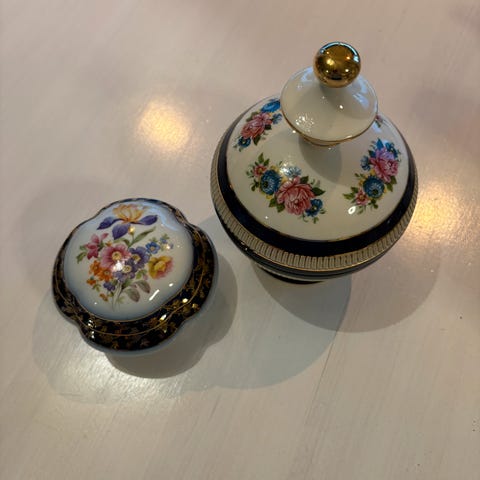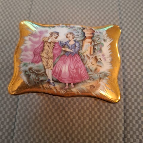 Håndmalt porselensboks i elegant hexagonal form ✨ Et virkelig pretty little thing – perfekt til smykker eller små skatter. Laget i Frankriket. Limogen porselen.