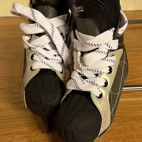 Barn skøyter i størrelse 32 beregnet for ishockey. Skøytene har svart og hvit farge og er designet for barn som utøver ishockey.