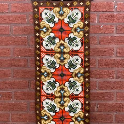 Brodert veggteppe med dekorative mønstre i flere farger. Passer til veggdekorasjon i hjemmet. 200 kr stykke