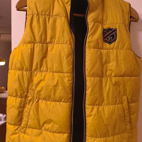 Hampton Republic 27 vattert vest i grønn farge. Kan vrenges og brukes med blå farge. Begge sider har lommer. Ingen størrelse synlig, men tipper den ligger et sted mellom 158-164.