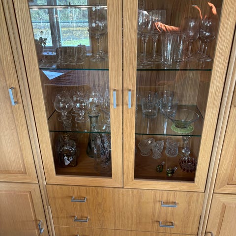Seksjonen består av to høye vitrineskap med glasshyller og integrert belysning, som gir flott utstilling av glass, servise eller pyntegjenstander. Midtdelen har skuffer og skap med god oppbevaringsplass.
