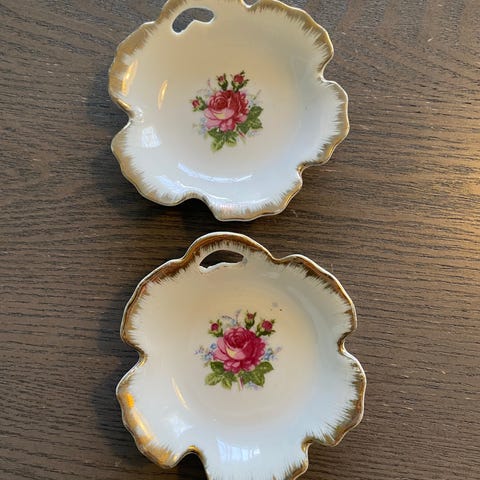 Iittala dekorative fat med håndmalt blomstermotiv i rosa, blått og grønt, med detaljer i gull. Fatene har en rektangulær form med avrundede hjørner og en blå kant rundt motivet. Egnet for dekorasjon eller servering av småretter. Fra Limogen. Str. 7,5 x 10,5 cm.