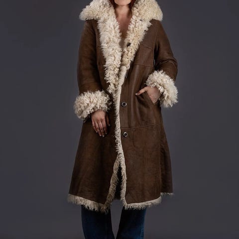 Selger deilig vinterkåpe i kombinasjon nappa/semsket skinn med fine pelsdetaljer rundt ermer og krave/hette, fra finn møller for kr 4500,- eller bud.