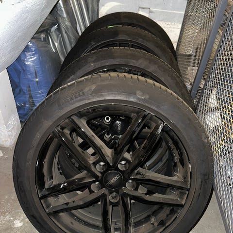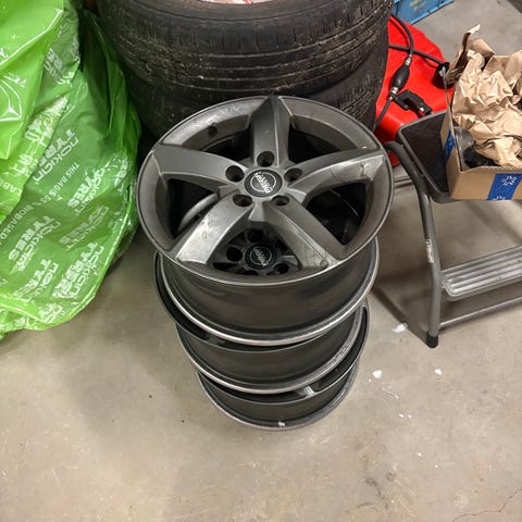 Lakkert svart med gummilakk som lett kan fjernes. Bildene viser felgene på bilen før og etter lakkering.