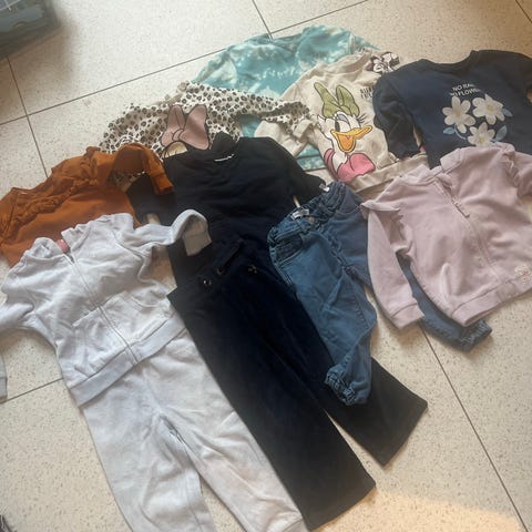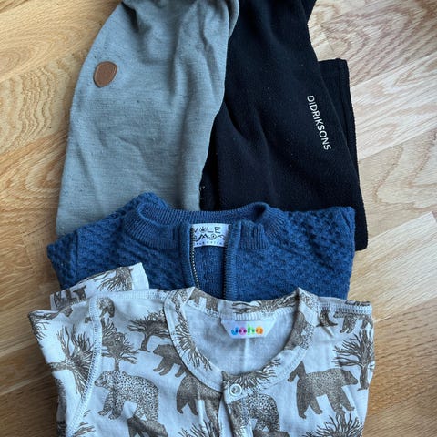 Klespakke varme klær str 80-86. Lue og votter fra Didriksons nesten ubrukt, votter refleks lite brukt, dress og labber fra Refleks som nytt, hals fra Joha i ull nesten ubrukt, jakke fra Joha i ull pent brukt, tykk ulllongs fra Safa pent brukt.
