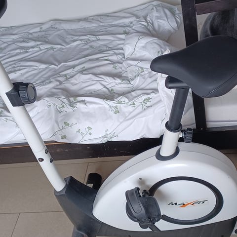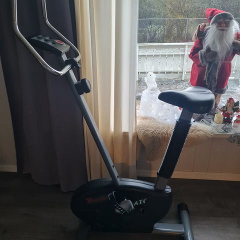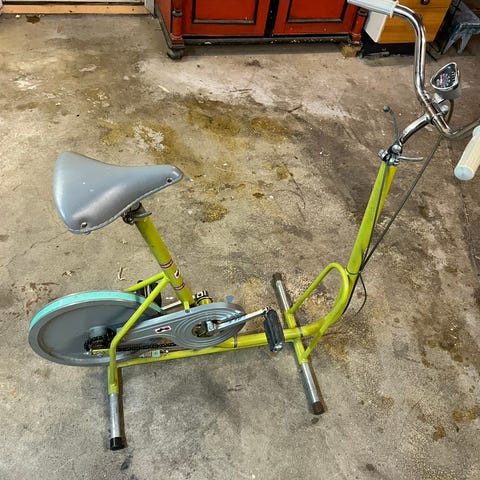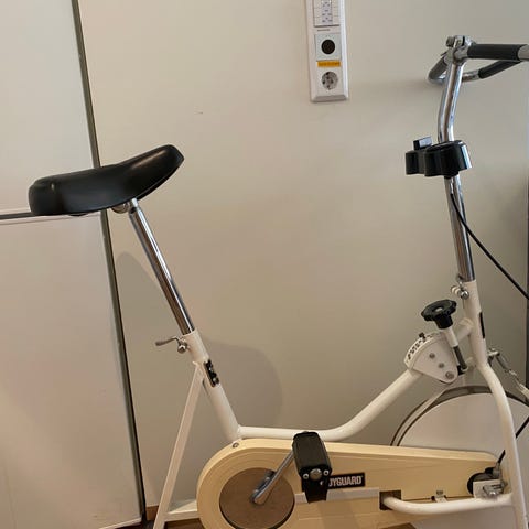 Monark treningssykkel i vintage stil med hvit farge. Utstyrt med analog måler for tid og distanse. Sykkelen har justerbart sete og håndtak med kromdetaljer. Egnet for innendørs trening. Må hentes