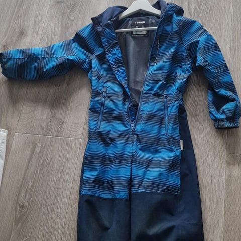 Overgangsdress i størrelse 122. Passer til høst/vår eller mild vinter med tykk ull under. Vært liggende ubrukt i lang tid, har vasket den. Litt slitasje, men ingen hull som jeg kan se. Behøver nye strikker under føttene