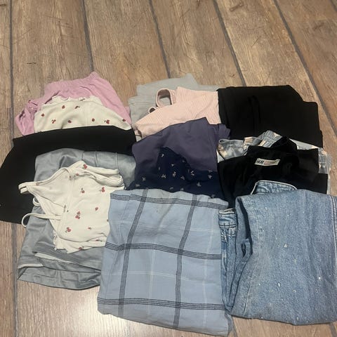 Noe lite brukt, mens noe mer brukt. Men ingenting med hull i. Alt er vasket. Minst 13 og 8 bukser +++litt mer kan dukke opp