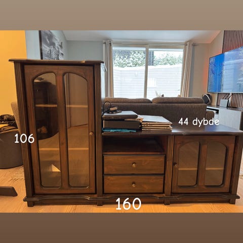 Pen skjenk selges billig grunnet flytting. Var en produksjonsfeil på skuffene som ble oppdaget ved montering. De kan fint åpnes/lukkes, men må brukes litt kraft. Ellers fremstår det som pent brukt. Noen merker etter at skuffer har vært tapet ved flytting.