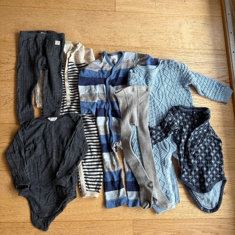 Det er en blanding av velos lite brukt og noe synlig slitasje, også håndstrikket.
