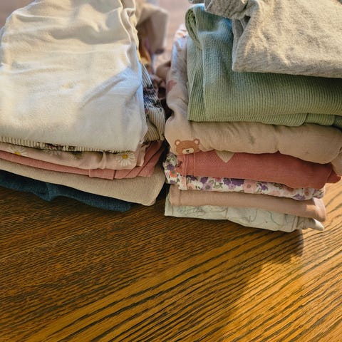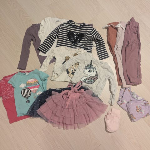 Flotte barneklær for jente i størrelse 86/92 , mest 98 - 104, med flerfarget design. Inneholder ulike plagg som bukser, gensere, flere skjørt, strømpebukser, sokker og cardigans i forskjellige materialer og farger. Passer for barn fra ca 1 år og oppover. Ingen feil eller mabgler, men noen bruksmerker forekommer.