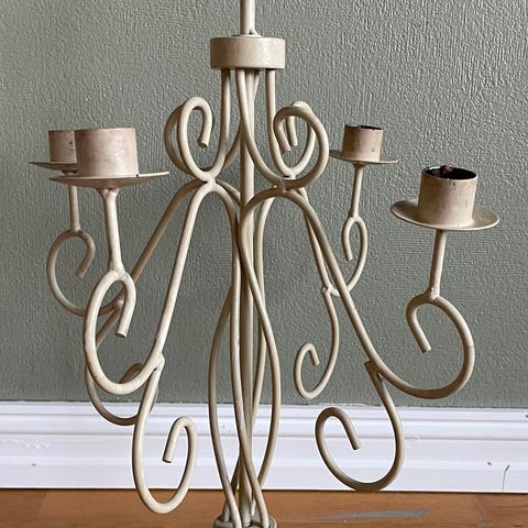 Enkel femarmet lysestake. 1,4 kg tung, ca 28 cm høy. Muligens i messing. Trenger rengjøring og pussing.