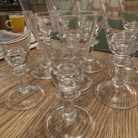 Hadeland Glassverk glass. Krystallglass med mønster, egnet for servering av drikke. Kan brukes til ulike anledninger. Dramglass? Rett over 8 cm høye. 7 stk.